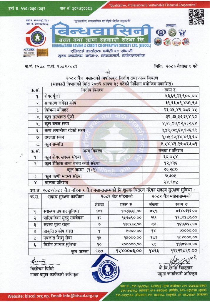 Bindhavasini Saving & Credit Cooperative Society Ltd (BISCOL) is the member, group and community based financial Co-operative institution which supports the members for socioeconomic upliftment with international cooperative principles...